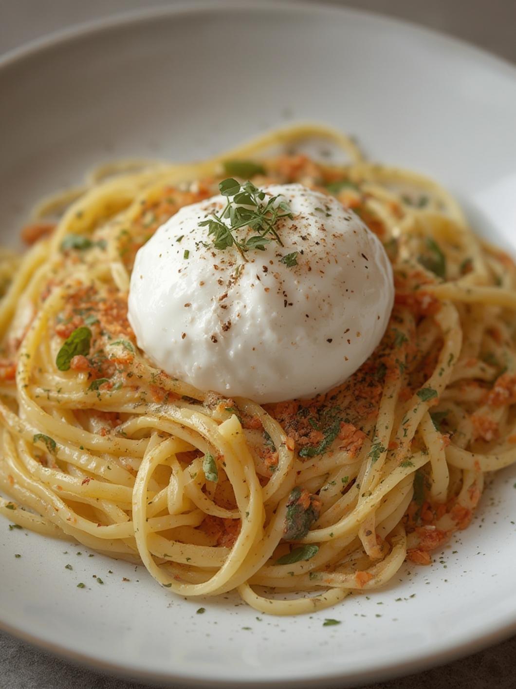 4. Add Burrata Cheese: Lower the heat, and gently place the burrata in the center of the pasta. Allow it to warm for 1-2 minutes, then use a spoon to break it open, letting the creamy interior mix with the pasta.