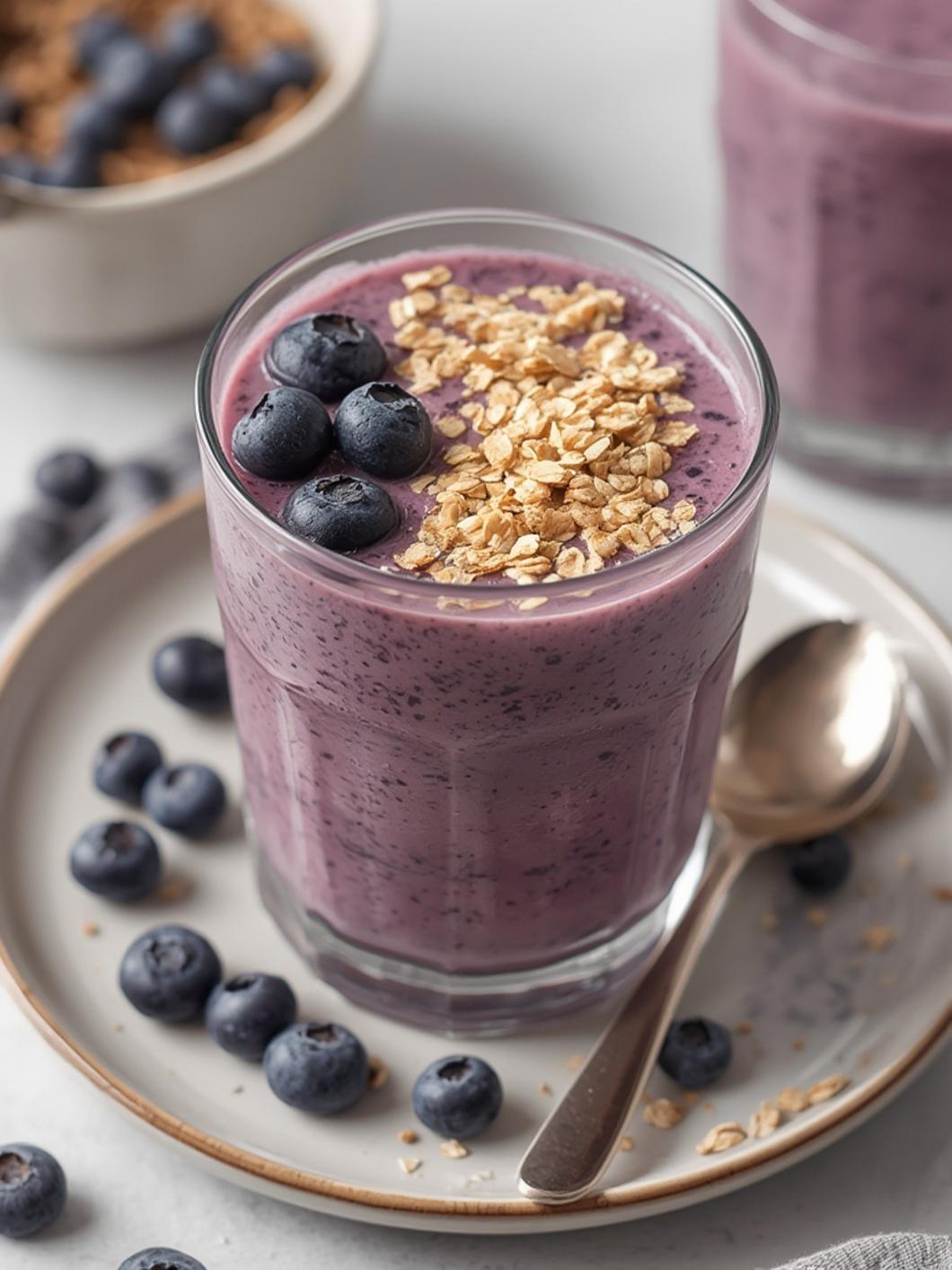 4. Serve and Enjoy: Pour your Blueberry Oatmeal Breakfast Smoothie into a glass or smoothie cup, and enjoy it immediately! Optionally, you can top it with some extra blueberries or a sprinkle of oats for added texture.